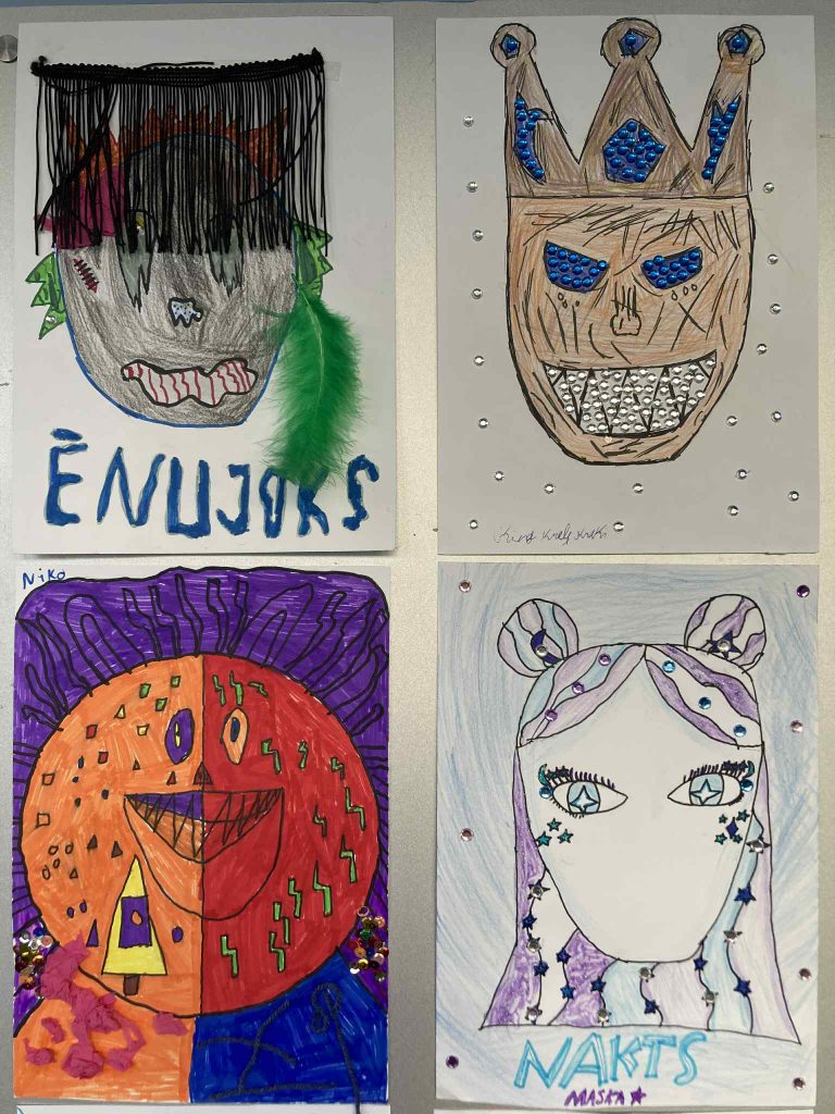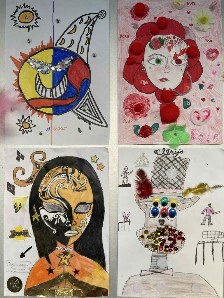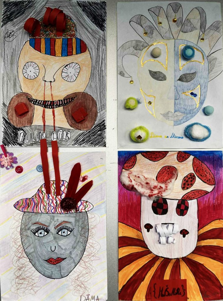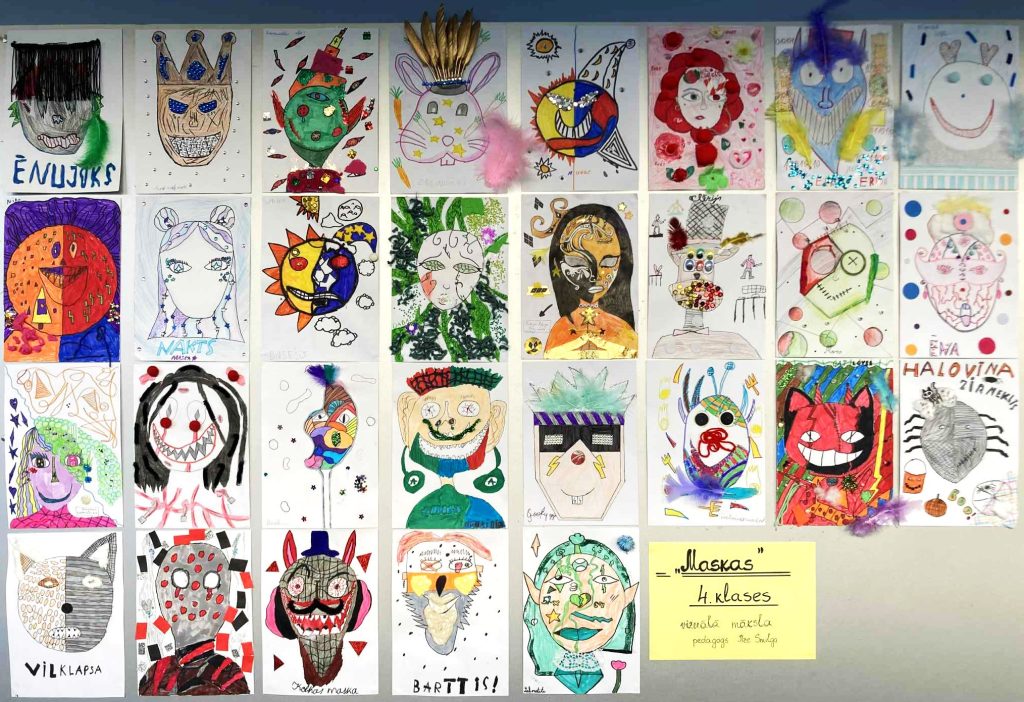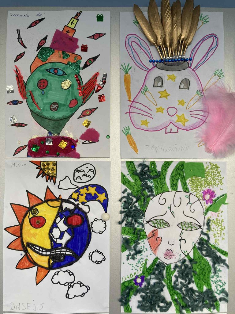 4.klašu skolēni vizuālās mākslas stundās radoši izpaudās un radīja masku zīmējumus. Tika eksperimentēts un piedomāts pie tēla, krāsām, laukuma, tekstūras, faktūras, aplicētām detaļām. Savai maskai skolēni piešķīra īpašo nosaukumu.