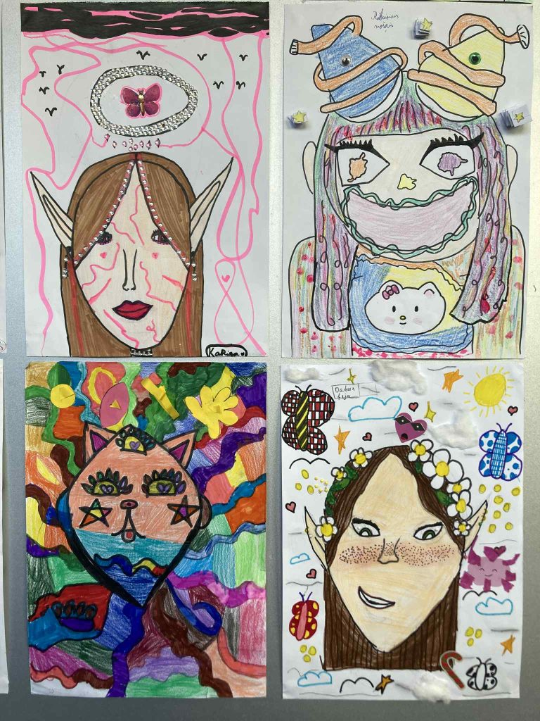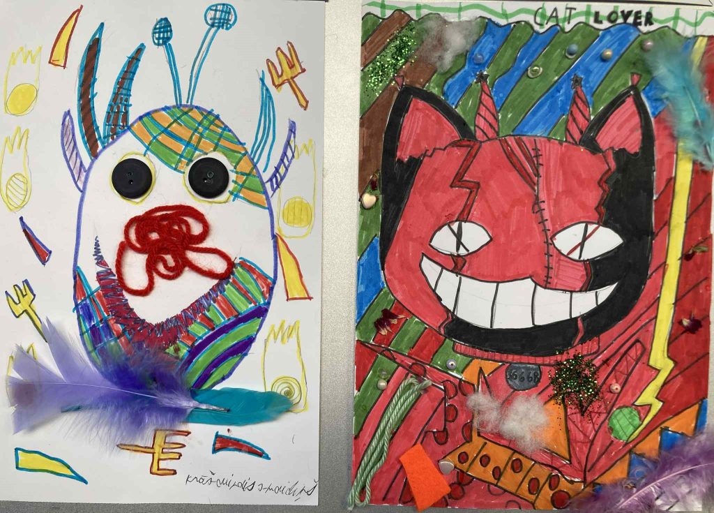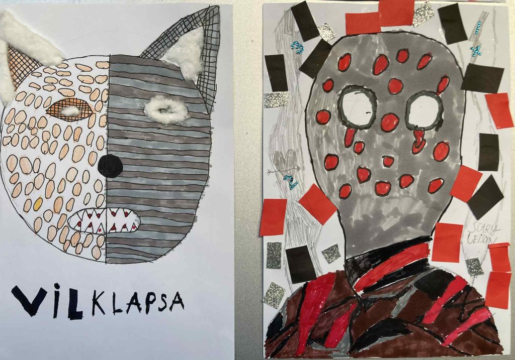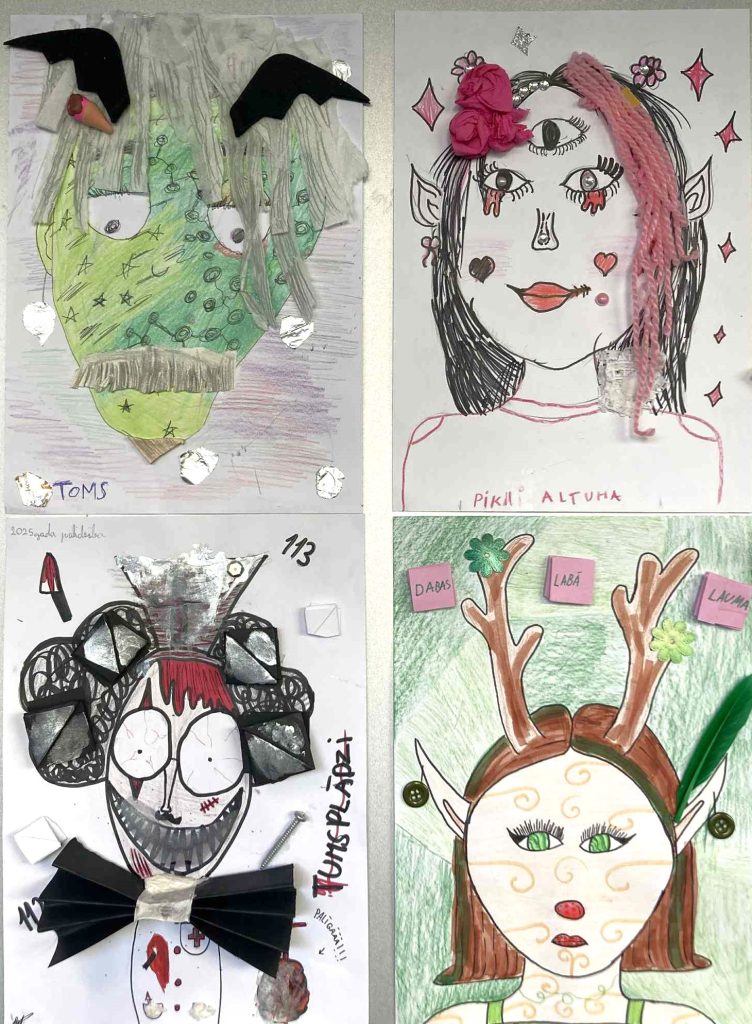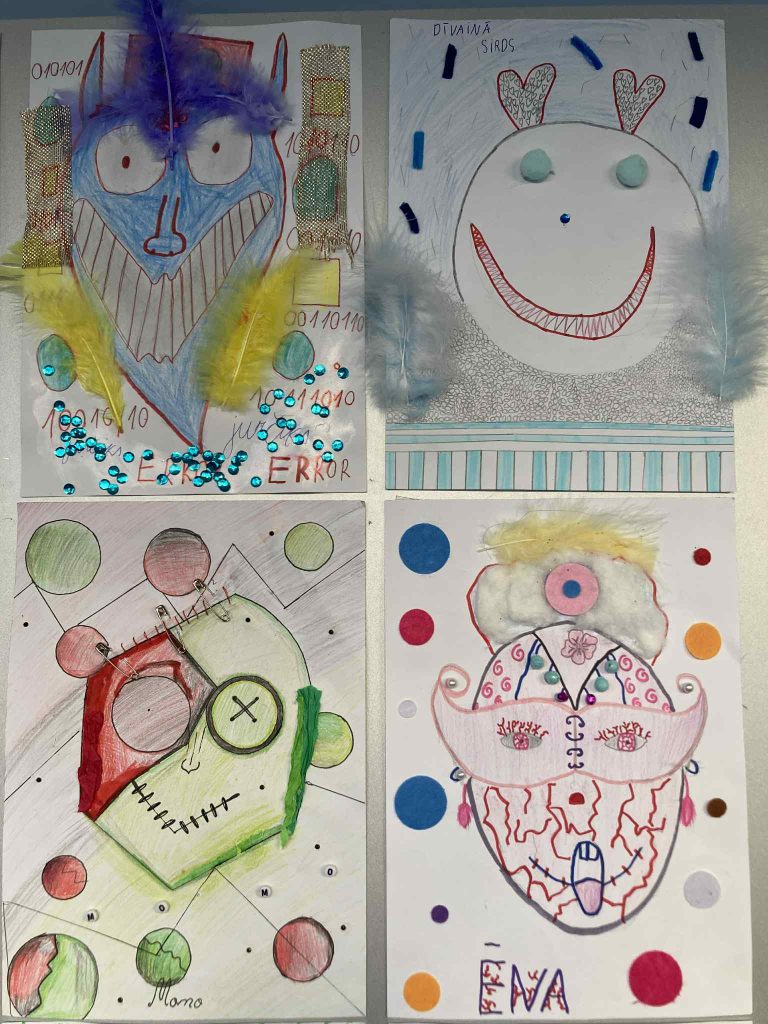 4.klašu skolēni vizuālās mākslas stundās radoši izpaudās un radīja masku zīmējumus. Tika eksperimentēts un piedomāts pie tēla, krāsām, laukuma, tekstūras, faktūras, aplicētām detaļām. Savai maskai skolēni piešķīra īpašo nosaukumu.