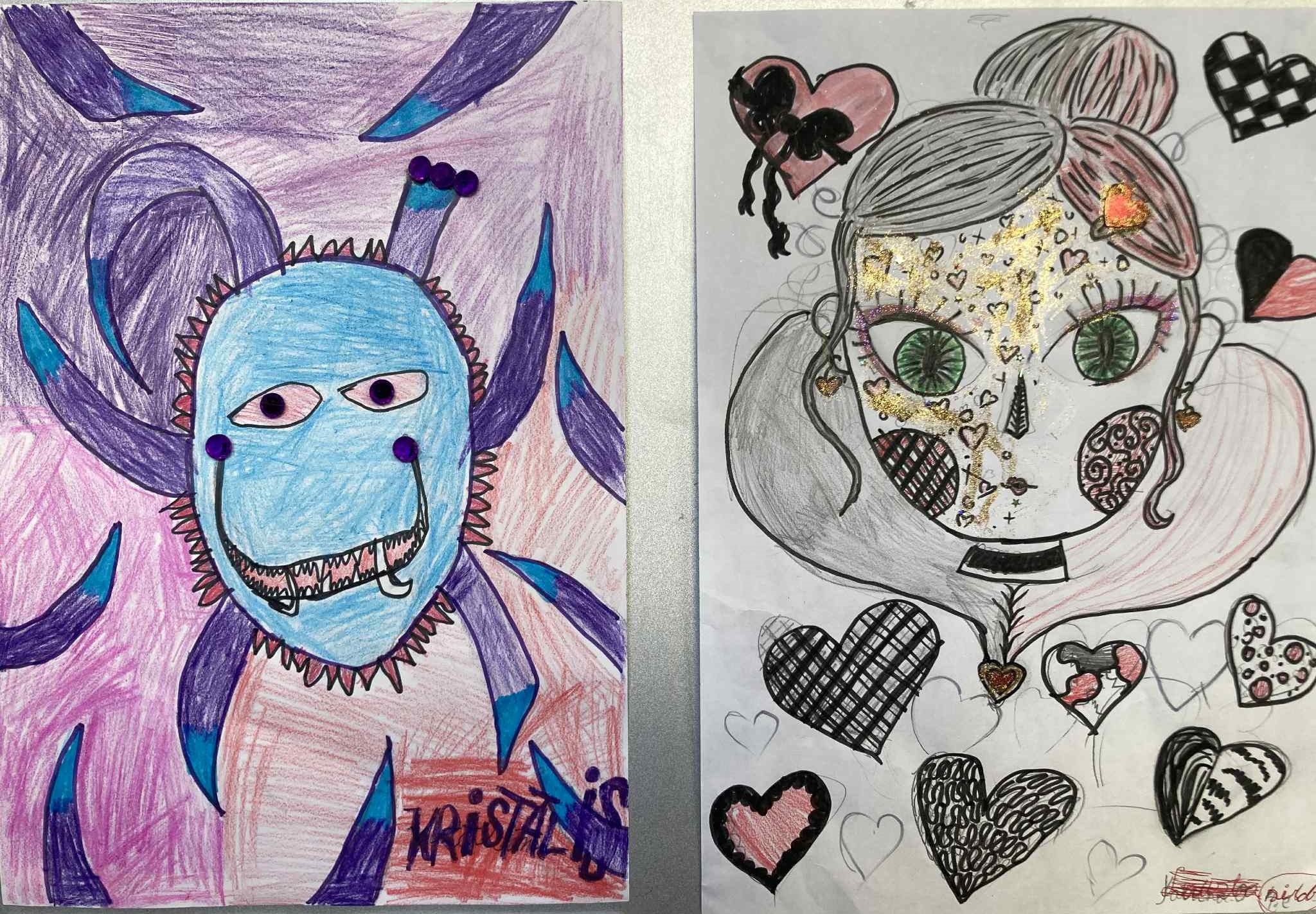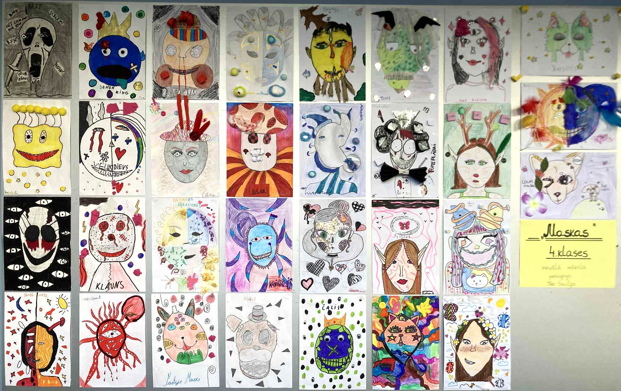 4.klašu skolēni vizuālās mākslas stundās radoši izpaudās un radīja masku zīmējumus. Tika eksperimentēts un piedomāts pie tēla, krāsām, laukuma, tekstūras, faktūras, aplicētām detaļām. Savai maskai skolēni piešķīra īpašo nosaukumu.