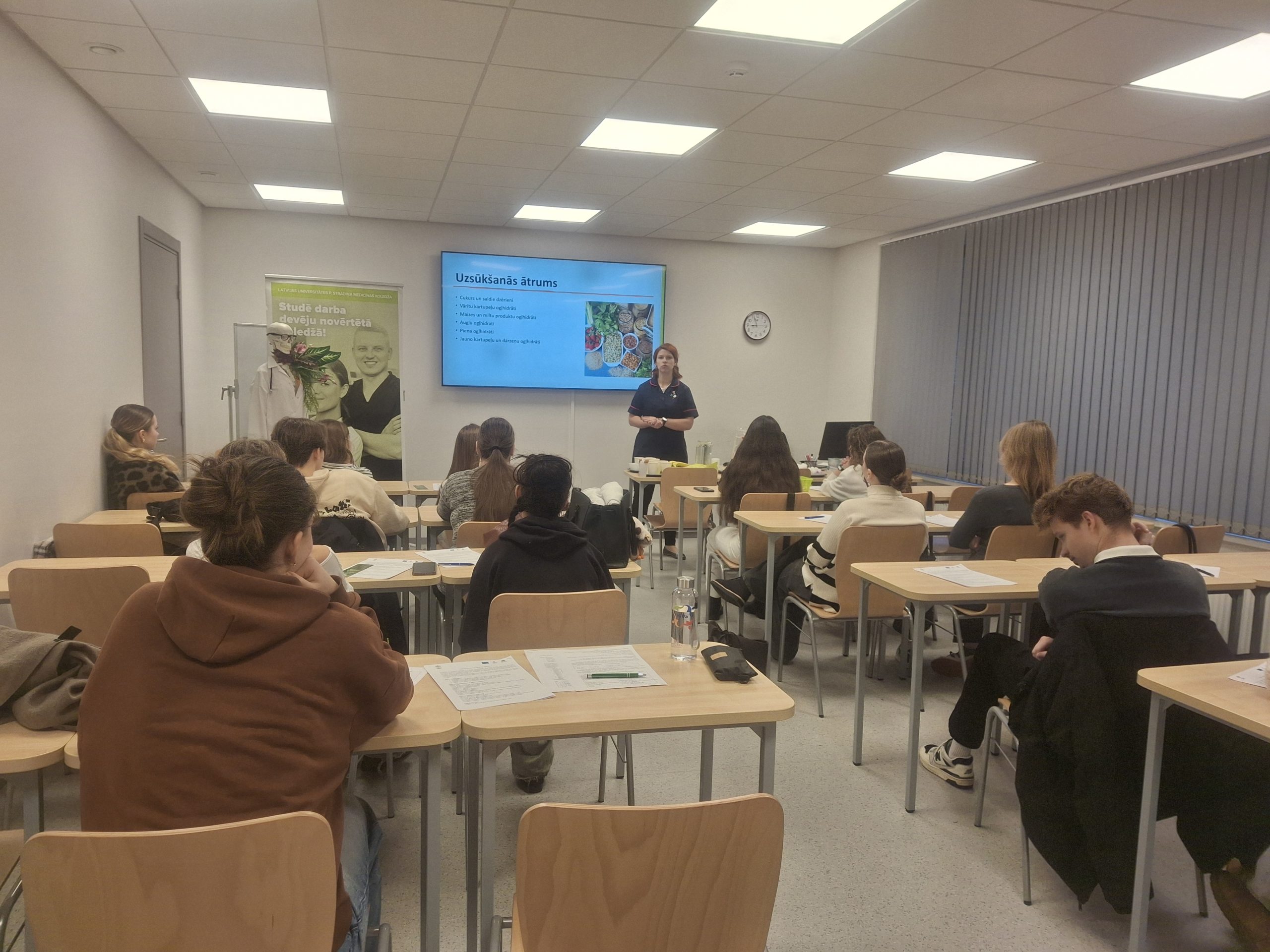 26. novembrī mūsu klase (12.B) devās uz LU P. Stradiņa Medicīnas koledžu Jūrmalā, lai uzzinātu vairāk par glikozes nozīmi un regulāciju organismā. Mēs uzzinājām, kas ir glikoze, par tās funkcijām un uzsūkšanos organismā. Kā arī mēs ieskatījāmies veselīga uztura principos, vielmaiņas procesā un zarnu mokrobioma sastāvdaļās.
