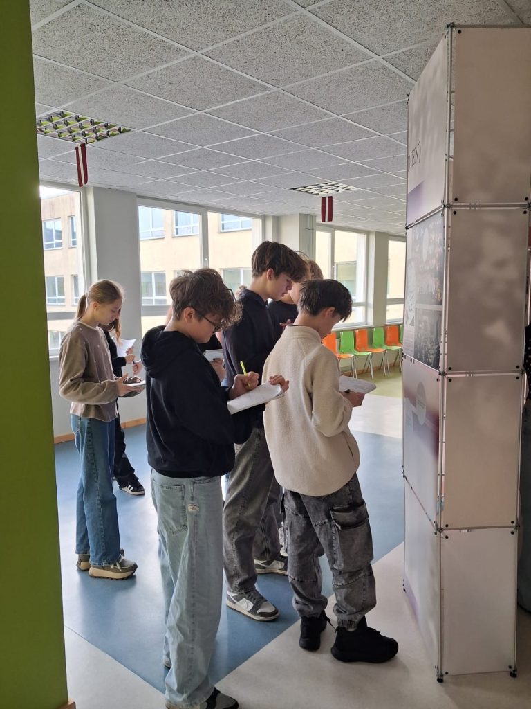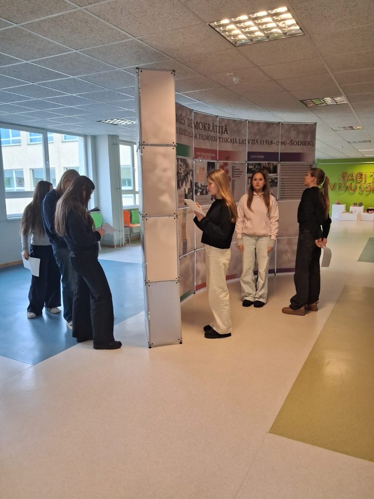 Papildu lekcijai skolēniem vēstures mācību stundās bija iespēja iepazīties ar izstādi “Es, tu, mēs demokrātijā. Sabiedrības līdzdalība demokrātiskajā Latvijā (1918–1990–šodien)”, kas vizuāli un saturiski bagātina izpratni par Latvijas politisko un sabiedrisko attīstību.
